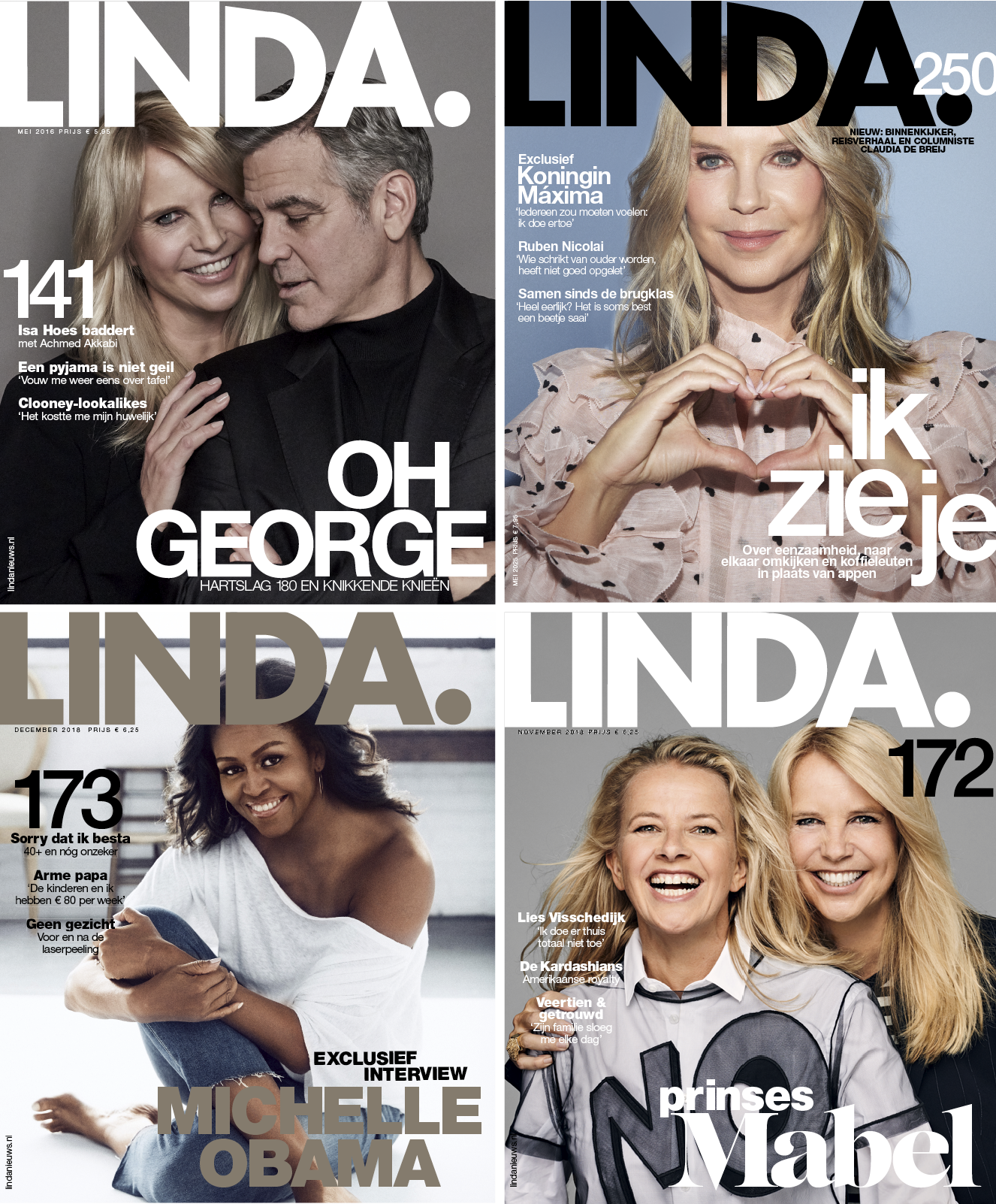 Mee met de tijd “Heel veel elementen uit de eerste LINDA. hebben we nog steeds, maar we hebben ook ontzettend veel aangepast in de vorm en tone of voice. Het is onze taak als mediamerk daar te zijn waar de lezer is. In 2006 begonnen we daarom als een van de eerste magazinemerken met social media, in 2007 met een grote nieuwssite en twee jaar geleden met het maken van premium content voor abonnees. We kijken steeds weer kritisch naar ons merk om te blijven vernieuwen. Als je dat niet doet, haalt de wereld je vanzelf in.”