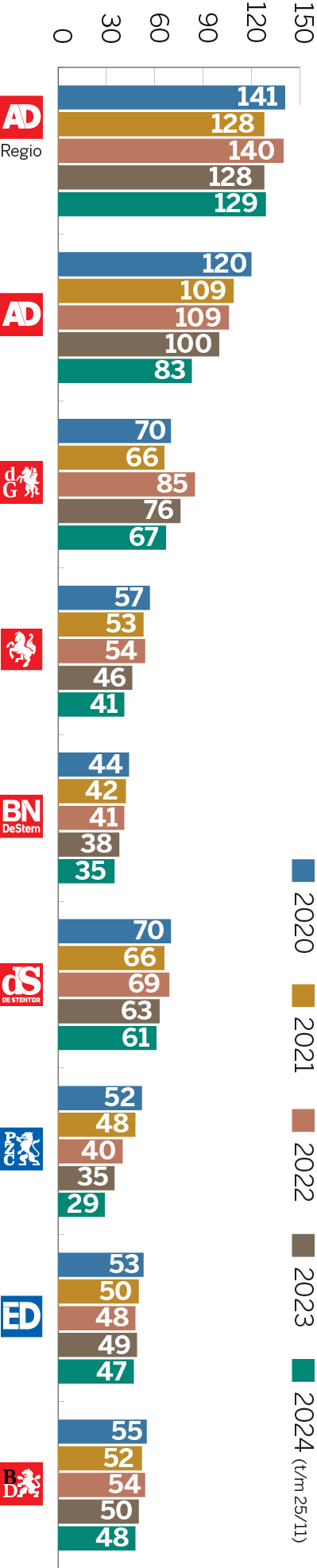 Dit geeft de omvang van de redactie weer, omgerekend in voltijds banen (fte). Het zijn zowel de verslaggevers als de chefs, eindredacteuren, vormgevers, beeldredacteuren, video- en podcastmakers en onlineredacteuren. Om het beeld zuiver te houden zijn de freelance journalisten niet opgenomen. Die leveren eveneens een belangrijke bijdrage in de vorm van artikelen, columns, beeld, audio en video. Het zijn er soms honderden per titel. Aantal en werkzaamheden fluctueren van jaar tot jaar.