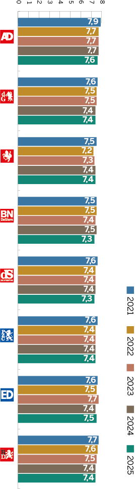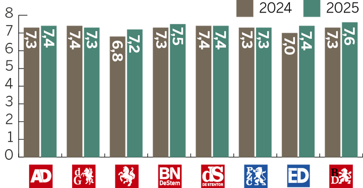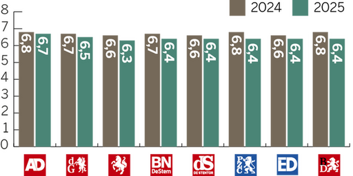 Dit cijfer is afkomstig uit recent onderzoek naar merkvertrouwen in opdracht van DPG Media. Daarbij geeft een algemeen publiek, dus niet alleen abonnees of bezoekers, vertrouwen in verschillende nieuwsmedia aan op een schaal van 0 (helemaal niet betrouwbaar) tot 10 (uiterst betrouwbaar). Daarnaast worden abonnees uitgesplitst, die hun titel doorgaans meer dan gemiddeld vertrouwen. Deze onderzoeksmethode en de uitkomsten komen overeen met die van het jaarlijkse Digital News Report van het Reuters Institutein Oxford. De Nederlandse en Vlaamse gemiddelde vertrouwenscijfers liggen in die monitor hoger dan die van nieuwsmedia in de omringende Europese landen.