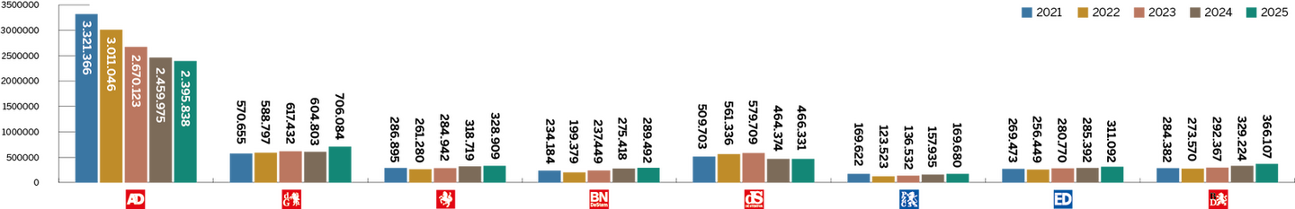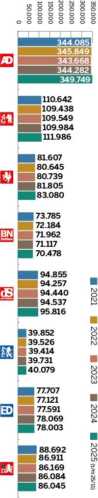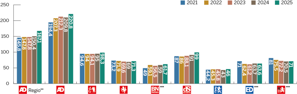 Dit is de som van papieren, digitale en hybride abonnementen. Het is het gemiddelde aantal over het desbetreffende jaar.